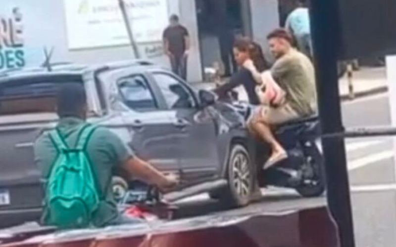 As imagens mostram uma motociclista, acompanhada de um passageiro na garupa, atravessando o veículo de forma transversal em frente a um carro, bloqueando completamente a via. Em seguida, a mulher gesticula de forma provocativa e chega a desafiar o motorista, fazendo sinais para que ele avance e colida com a motocicleta.