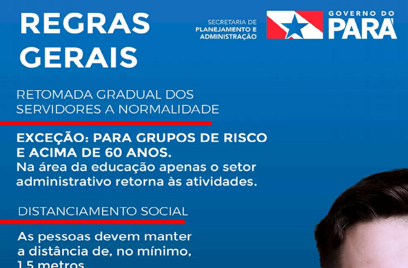 Um documento da Secretaria de Planejamento e Administração do Pará (Seplad) circulou pelas redes sociais, nesta quarta (20), informando o cronograma de retorno das atividades em órgãos públicos do Estado e com orientações sobre a Covid-19 aos servidores e colaboradores. O informativo é oficial, segundo a Secretaria de Estado de Comunicação (Secom).