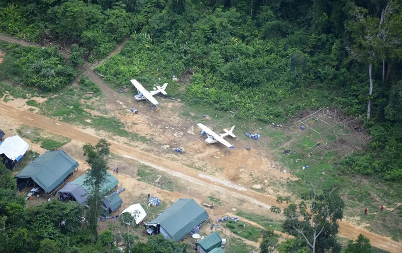 “Currutela” no alto Catrimani, além de pista de pouso clandestina. Aeronaves dão suporte à atividade. — Foto: Divulgação/HAY