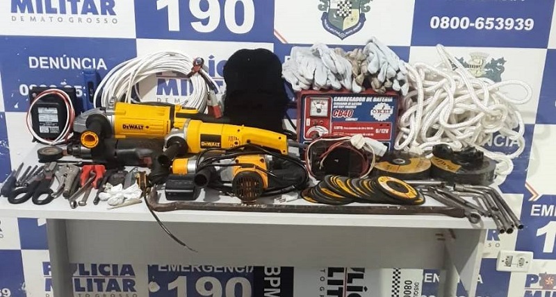 Com a dupla, os policiais apreenderam três mochilas, uma corda, alicate de pressão, tesoura, brocas, chave teste, ponteira para martelete, chave de fenda, faca de serra, lanterna, bala clava, extensão, autotransformadores, martelete, lixadeiras, furadeira, pé de cabra, pacotes de disco, carregador de bateria, óculos e outros.(A informação é do Portal Só Noticias_)