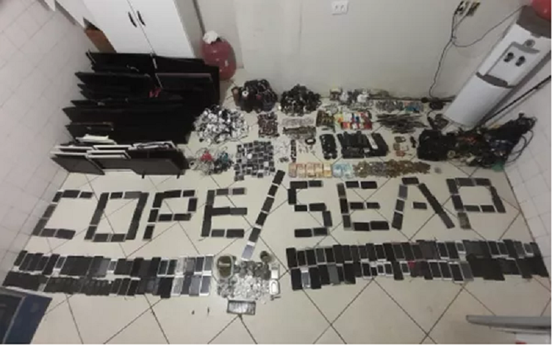 Ainda foram achados R$6 mil, 110 celulares, 45 carregadores, 35 extensões elétricas, 46 pendrivers, 60 chips, 63 celulares, dois tabletes de maconha e 17 máquinas de cortar cabelo.