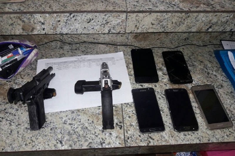 Charlene Rosa dos Santos e Maria Cristina Vieira de Souza guardavam dentro das bolsas duas pistolas ponto 40, que são de uso exclusivo das forças militares, além de cinco celulares.
