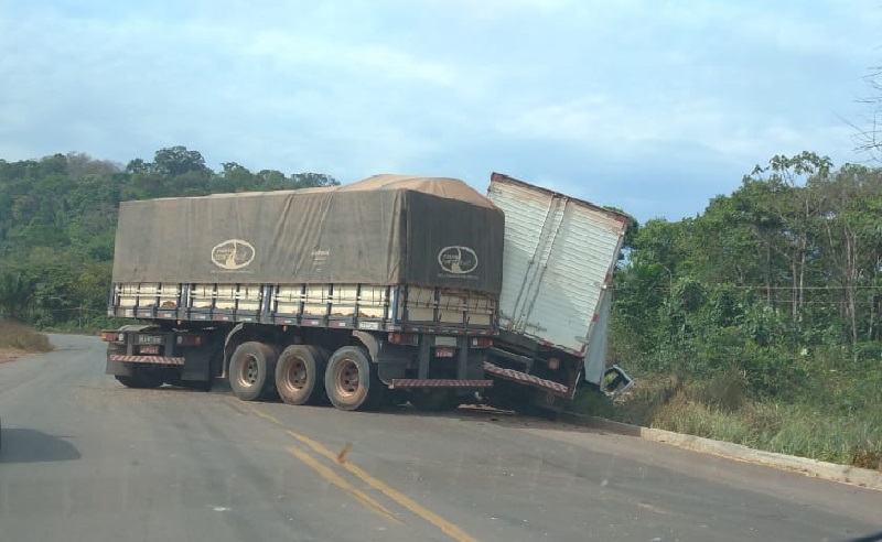 Um acidente envolvendo uma carreta e um caminhão baú, deixou duas pessoas gravemente feridas na tarde desta quinta-feira (27), na BR-163, a cerca de 15 km do distrito de Moraes Almeida, em Itaituba. (Foto:Via WhatsApp )