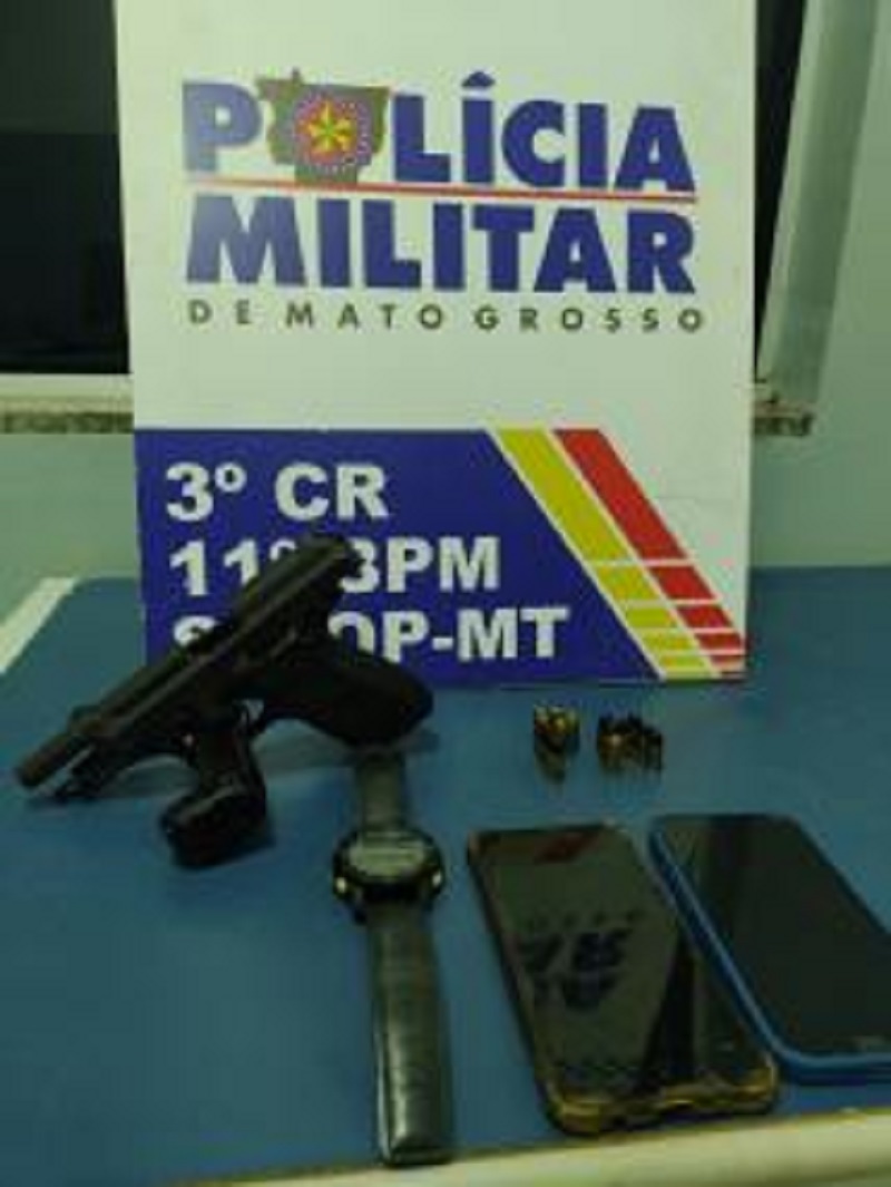 Dois homens, de 27 e 29 anos, foram presos em flagrante, por tentativa de homicídio, na noite desta sexta-feira (24), em Sinop (500 km ao norte de Cuiabá). Com os suspeitos, a PM apreendeu uma pistola carregada com 15 munições.