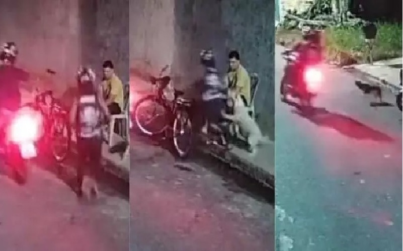 O garupa desce do veículo e toma o aparelho, enquanto aponta uma arma ao homem. No mesmo momento, o condutor da moto aponta uma arma para uma criança do outro lado da rua, que corre para dentro de um imóvel. Um dos cães, que está perto da vítima, avança em direção ao garupa, que tenta se defender das mordidas com uma bicicleta que estava parada no local.