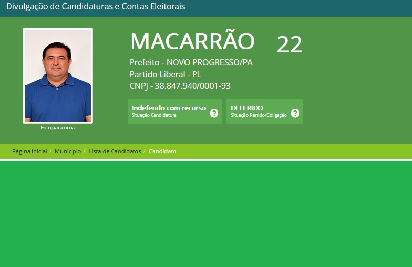 Em entrevista ao Jornal Folha do Progresso, Macarrão (PL) disse que estava confiante na justiça, com a certeza que só foi prefeito uma vez, agora vamos trabalhar mais firmes e reativar nossa campanha para obter a vitória nas urnas,concluiu. Macarrão(PL) busca a reeleição.