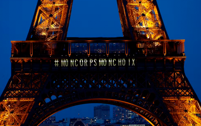 Torre Eiffel com a frase ‘Meu corpo, minha escolha’ após a França tornar o aborto um direito constitucional — (Foto: Abdul Saboor/Reuters)