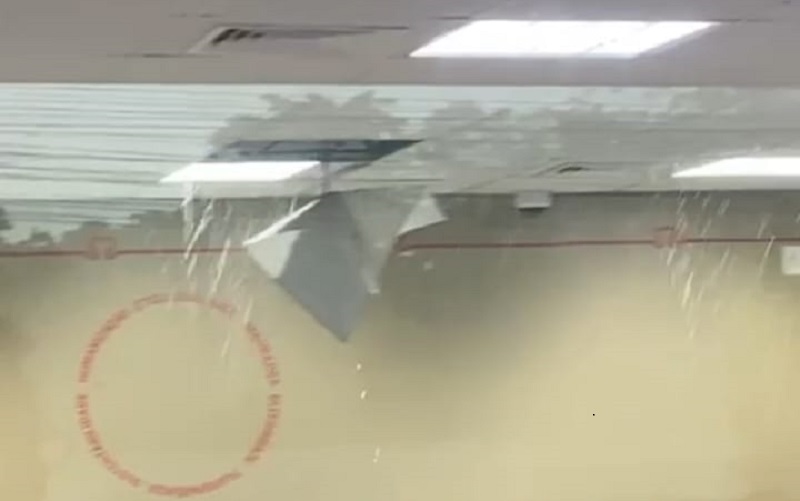 Vídeos que circulam pelas redes sociais mostram a unidade de saúde com diversas goteiras – assista acima. Uma parte do teto de uma área do hospital chegou a desabar, conforme mostram as imagens.