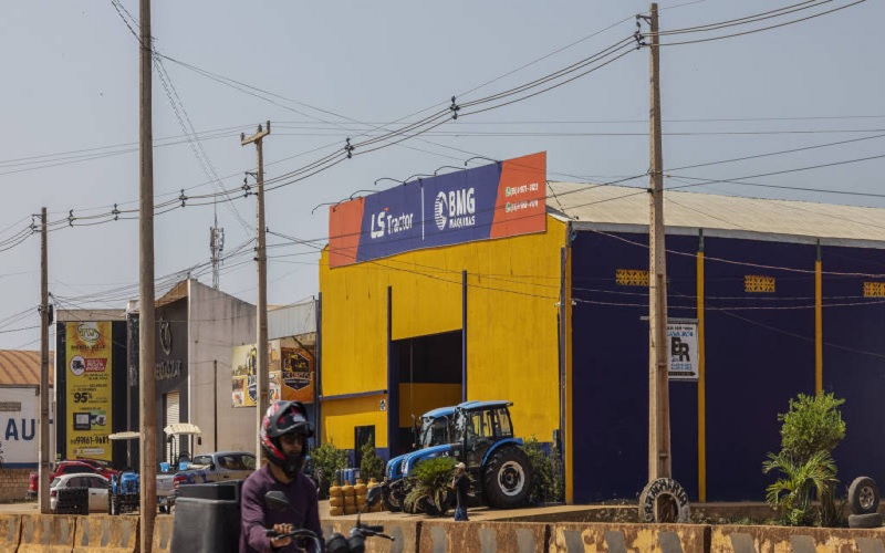 Escavadeiras não são expostas, apenas tratores agrícolas. Dentro, uma sala é reservada para o atendimento a clientes interessados na compra de escavadeiras para garimpos. Funcionários fazem o orçamento e dizem que o maquinário pode ser levado da matriz em São Paulo à região amazônica.