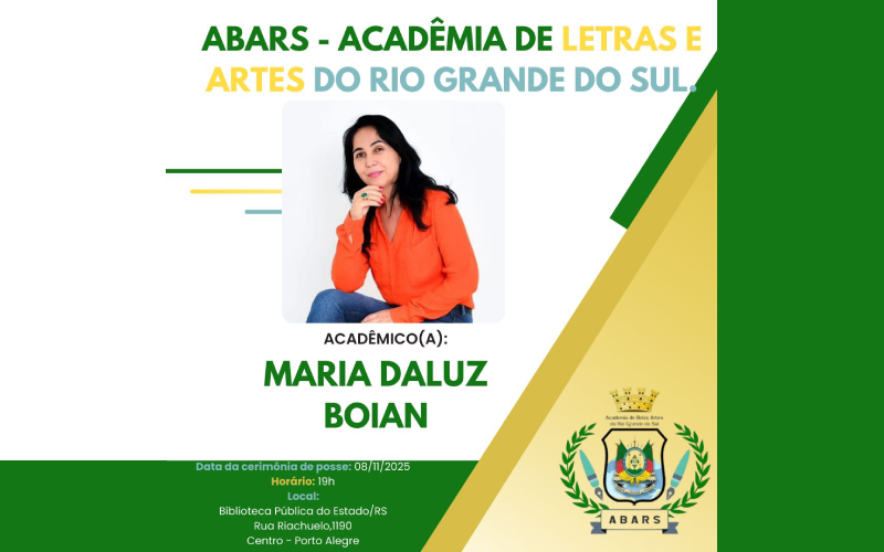 A escritora e educadora Maria Daluz Boian, moradora de Novo Progresso (PA), recebeu mais uma importante honraria no cenário cultural brasileiro. No próximo dia 08 de novembro, às 19h, na Biblioteca Pública do Estado, em Porto Alegre (RS), ela será oficialmente empossada como acadêmica da ABARS – Academia de Letras e Artes do Rio Grande do Sul.