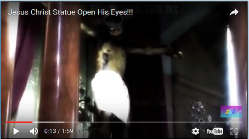 Com a câmera trêmula, uma pessoa filma uma estátua de Jesus e ao fazer um zoom, a imagem aparentemente abre os olhos e a encarra.