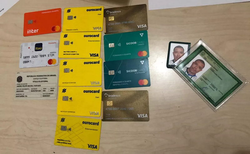 No momento em que foi preso, o estelionatário estava com cartões e documentos pessoais com quatro nomes diferentes: Fábio Monteiro Ferraz Souza, Matheus H. Borges Mattos, Fernando A. Duarte e André Felipe Maciel Furtado.