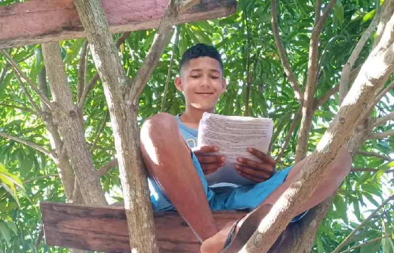 Artur Ribeiro, de 15 anos, estuda em cima de mangueira para não perder aulas remotas — Foto: Lúcia Ribeiro/Arquivo Pessoal
