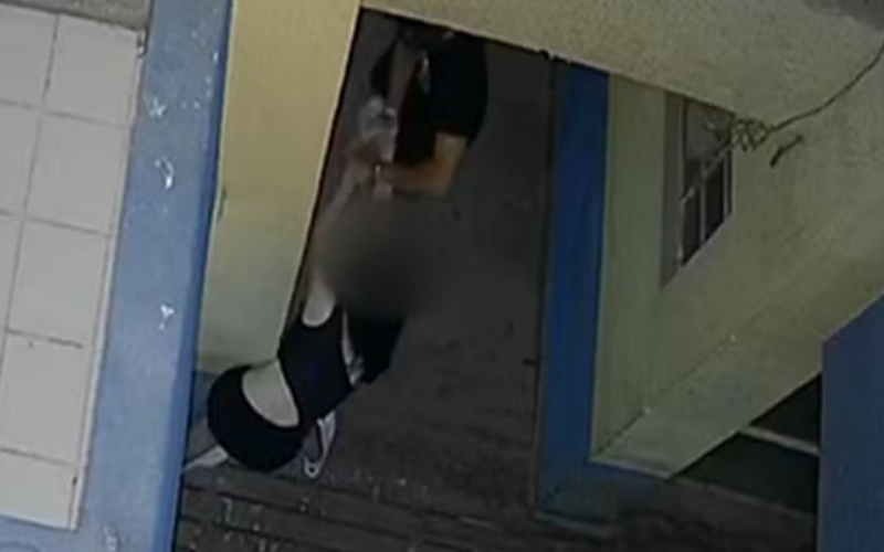 A câmera do posto gravou a vítima tentando sair de perto de Nathan e se agarrar à parede, mas ele segurou os braços dela e conseguiu arrasta-la até o banheiro.