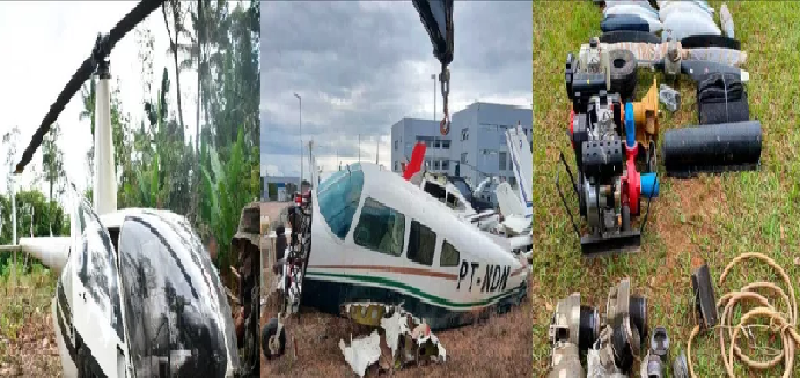 Helicóptero, aeronave e materiais apreendidos no garimpo — Foto: Divulgação/Exército brasileiro