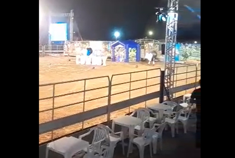 No vídeo é possível ver que, no momento em que o narrador trabalha com as montarias em touro, havia poucas pessoas no local do evento.