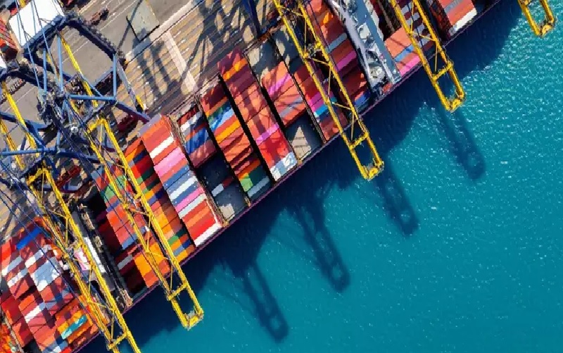 Vista aérea de navio de carga e de contêiner de carga em porto. (Foto: Freepick)