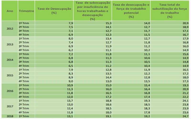 No 4º trimestre de 2017, a taxa de subutilização da força de trabalho tinha ficado em 23,6%, reunindo 26,4 milhões de pessoas. Já a taxa média anual para 2017 ficou em 23,8%.