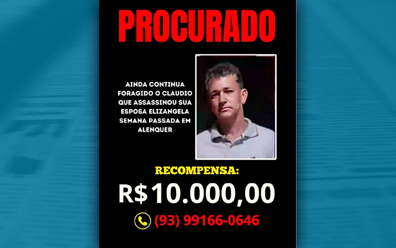 A família de uma mulher assassinada em Alenquer (PA) pelo companheiro está oferecendo R$ 10 mil de recompensa para quem encontrar o acusado de prenome Cláudio, vivo ou morto.