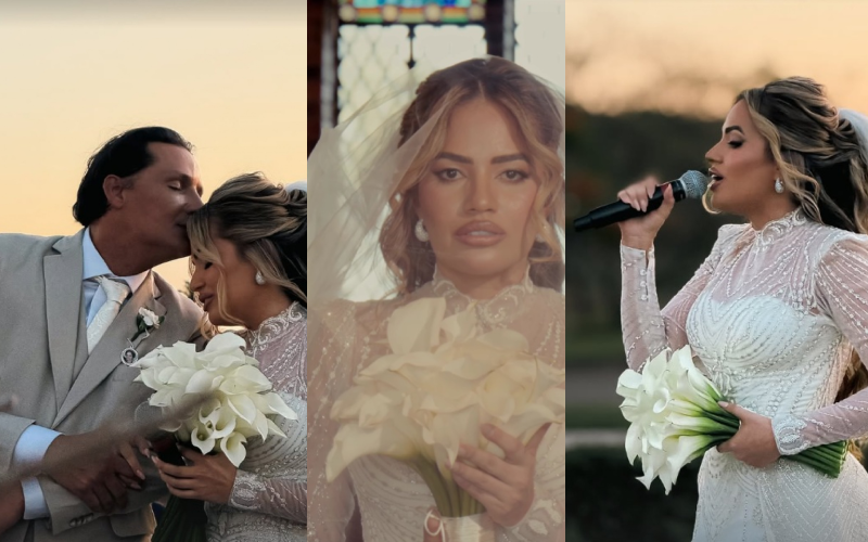 O noivo caminhou até o altar ao lado da sogra Joelma, e Natália entrou sozinha, cantando. O vestido dela tinha gola alta, ombreiras, mangas longas e bordados, além do véu.