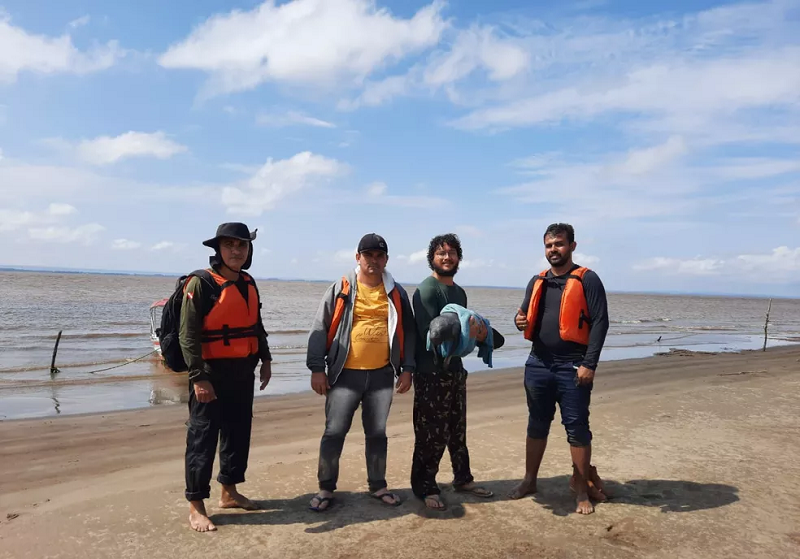 O animal estava preso em um igarapé que está secando devido a vazante dos rios. Há suspeita de que a mãe tenha sido capturada por pescadores.