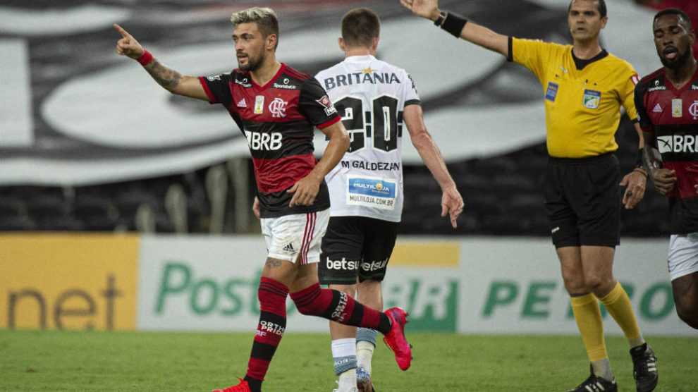 Só que aos 26 minutos, o Flamengo chegou ao segundo gol no Maracanã. Isla cruzou rasteiro para Arrascaeta, que finalizou no canto.