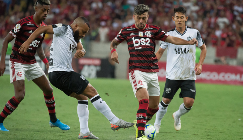 O jogo – O Flamengo começou a partida pressionando o Ceará e criou a primeira boa chance aos sete minutos. Após cruzamento, Rodrigo Caio escorou e Willian Arão cabeceou com perigo. Depois, foi a vez de Arrascaeta pegar sobra e chutar no travessão.