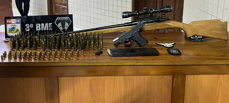 Armas e dezenas de munições foram apreendidas pela polícia com um foragido da Justiça em Castanhal, no nordeste do Pará. A prisão ocorreu após o homem atacar policiais civis com tiros de fuzil e foi divulgada nesta segunda-feira (27) pela polícia. Ninguém ficou ferido.