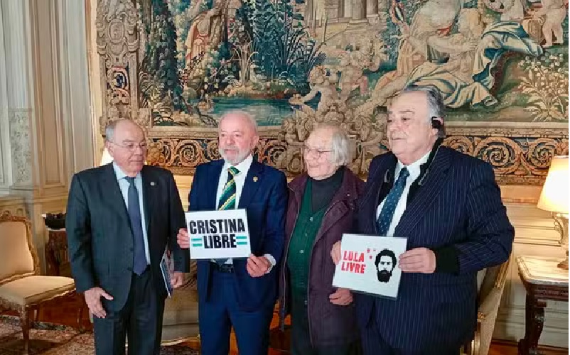 A foto de Lula com o cartaz escrito “Cristina Livre” foi publicada em uma rede social pelo escultor argentino Adolfo Pérez Esquivel, prêmio Nobel da Paz de 1980. Na imagem, o deputado argentino Eduardo Valdés, do partido União pela Pátria, segura uma folha com a inscrição “Lula livre”.
