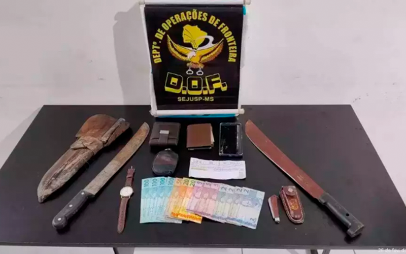 Facões apreendidos com autores junto a pertences da vítima. (Foto: Divulgação/DOF)