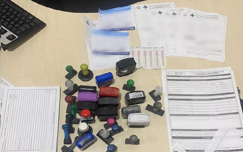 A Polícia Militar esteve na casa do suspeito e encontrou “29 carimbos de médicos que atuam em diferentes especialidades, cápsulas de medicamentos, um bloco de receituário em branco, um bloco de declaração de comparecimento, agulhas, seringas e outros materiais relacionados à área da saúde”.