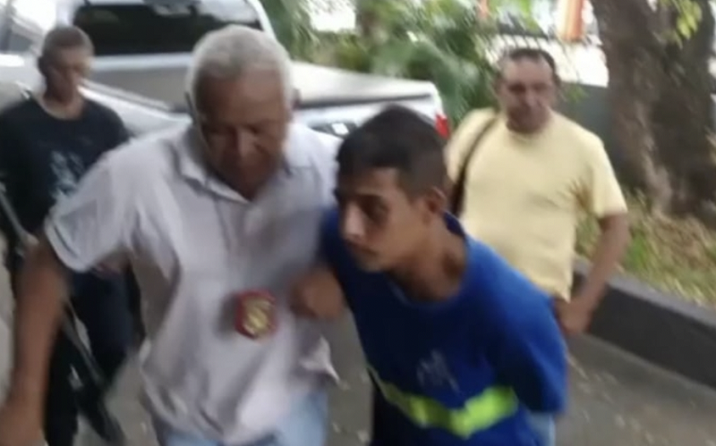 Alan César chegando na delegacia em Manaus.   (Foto:Reprodução cm7) – Alan César Multimo Rolim e um amigo chamado apenas de Romário, foram presos na manhã desta quinta-feira (30), pela suspeita de assassinar o ex-patrão agricultor, Ivan Batista Maciel, de 69 anos. O crime aconteceu no ramal Hollywood, na rodovia  BR-174, interior de Manaus.