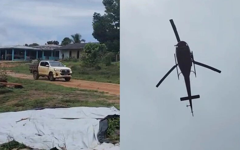 Foto: Reprodução | Imagens registradas mostram o momento em que agentes sobrevoam a área a bordo de um helicóptero, enquanto garimpeiros, em caminhonetes, tentam fugir da abordagem.