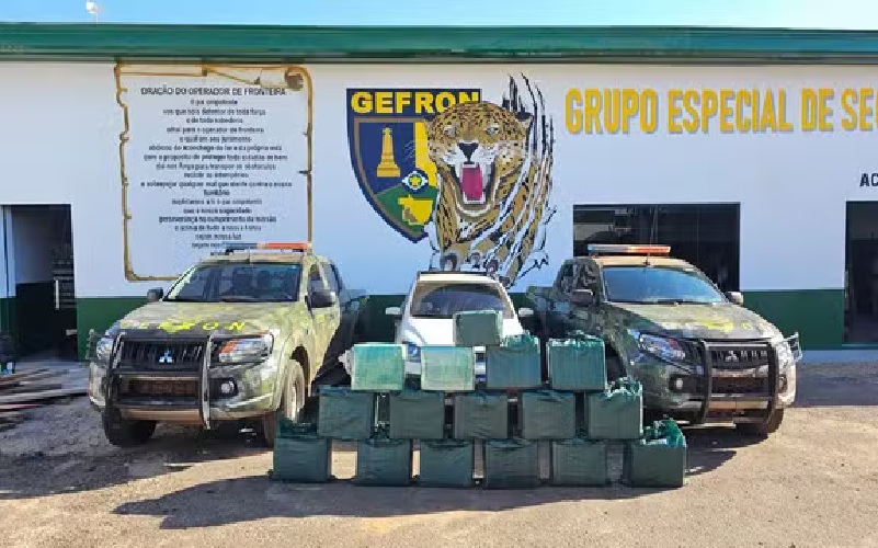 O Grupo Especial de Fronteira (Gefron) realizou buscas na mata e encontrou mais de 480 quilos de cocaína, entre pasta base e cloridrato, além de sete rádios comunicadores e um veículo utilizado no transporte da droga.