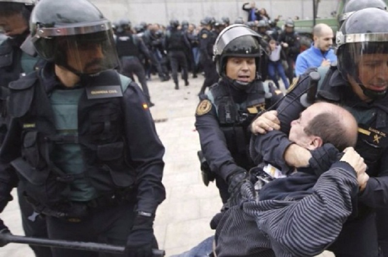 Com os braços estendidos para cima, os eleitores concentrados diante de centros de votação foram alvo, em várias ocasiões, de golpes de cassetete, disparos de balas de borracha — um homem foi levado às pressas para ser operado no Hospital Sant Pau, de Barcelona, por ter recebido um disparo no olho —, ou agredidos diretamente. Como a mulher que, apoiada no corrimão, dentro do Institut Pau Claris foi agarrada pelo braço por um policial, que a empurrou escada abaixo.
