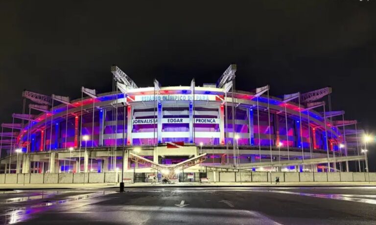 Foto Reprodução| Na noite desta terça-feira (11), o Estádio Olímpico do Pará “Jornalista Edgar Proença”, o Mangueirão, foi iluminado nas cores da bandeira do Estado, em homenagem à Conferência das Nações Unidas sobre Mudança do Clima (COP30). A ação celebra também o período em que Belém se torna, oficialmente, a capital do Brasil durante o evento ambiental, entre 11 e 21 de novembro.