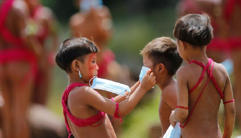 Crianças do povo Yanomami, em Roraima, colocam máscara de proteção contra coronavírus (Foto:Adriano Machado / Reuters)