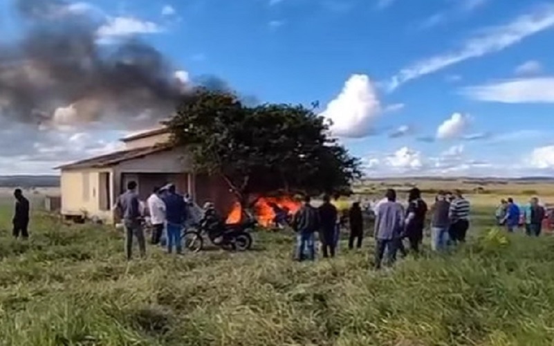 Grupo de produtores queima lonas e tábuas de estrutura que MST começa a montar em fazenda baiana – (Foto: Reprodução/Itiriçu Online)