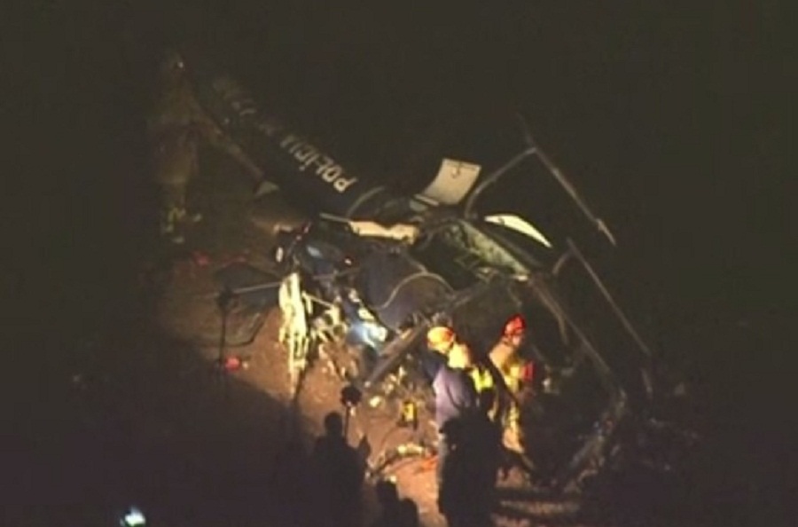 Imagens que circulam por redes sociais mostram o momento exato em que o helicóptero cai (veja o vídeo abaixo) e, depois, a aeronave já no chão e muita fumaça saindo das ferragens.