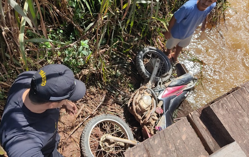 Homem cai com moto de ponte danificada, é socorrido por agentes de trânsito em Novo Progresso