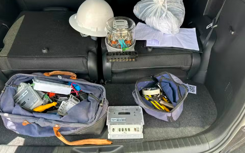 Os agentes informaram que, com o suspeito, foram encontrados medidores de energia, diversos equipamentos de segurança usados por eletricistas e uniformes da empresa de energia.