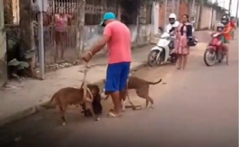 Moradores da 29ª rua do bairro Santo Antônio, em Itaituba, na região sudoeste do Pará, registraram o momento em que um tutor de pitbulls passeava com dois cães da raça, presos na coleira, e permitiu que os animais atacassem um cão na rua. O caso ocorreu na tarde do último domingo (23).
