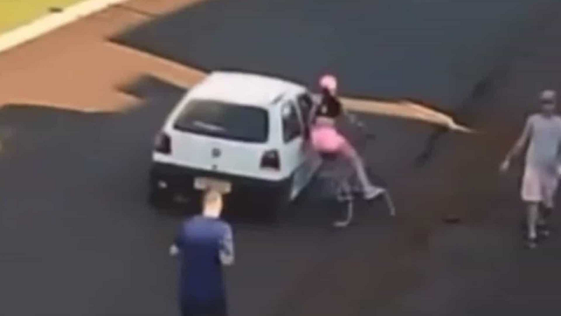 Homem dentro de carro passa a mão em mulher e a derruba de bicicleta
