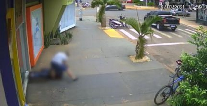 Nas imagens registradas por câmeras de segurança é possível ver o momento que a vítima cai em frente ao empreendimento e é alcançado pelo agressor, que defere novos golpes de facada.