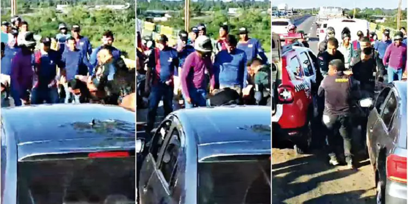 De acordo com os agentes que participaram da autuação, o suspeito estava completamente descontrolado. Os policiais viram a cena quando estavam a caminho do trabalho e entraram em luta corporal com o suspeito para defender a mulher da tentativa de feminicídio. O homem não queria se entregar e teria tentado agredir os agentes. Populares que passavam pela ponte pararam e auxiliaram os policiais para segurar o suspeito.