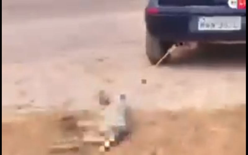 A cena foi registrada por um motociclista que passava pelo local, o animal aparece amarrado a um carro, sendo puxado ao longo da rodovia.