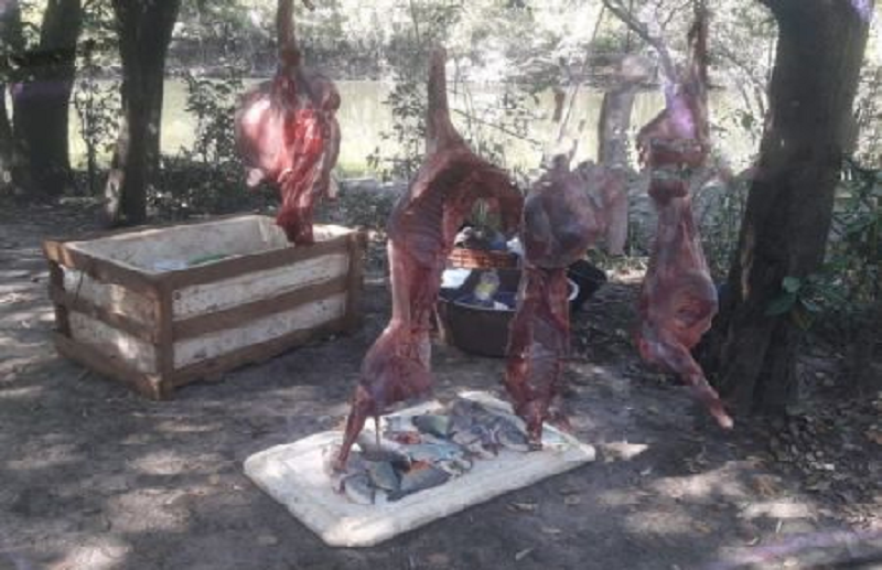 Os policiais encontram carne de caça e um jacaré, além de munições