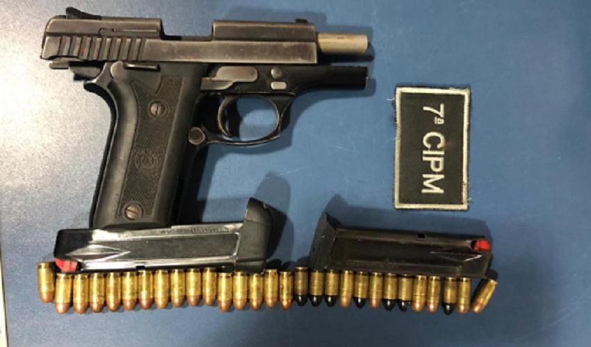 Em revista, com Jair foram encontrados e apreendidos 1 (uma) pistola 938 calibre 380 com dois carregadores e 29 (vinte nove munições) intactas.