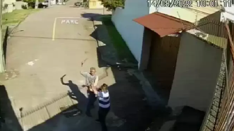 Imagens de uma câmera de segurança mostram o momento em que o idoso, que teria cerca de 60 anos, corre atrás o filho e o acerta várias vezes com a faca, no meio da rua. A vítima de 35 anos ficou ferida e foi ao chão.