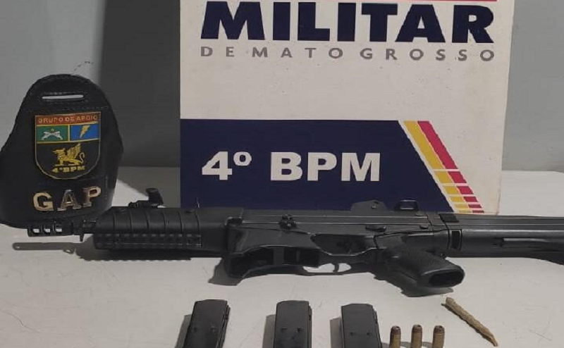 A Polícia Militar apreendeu uma submetralhadora .40 com carregadores e munições e prendeu um homem, de 22 anos, por porte ilegal de arma de fogo e uso de ilícitos, em Várzea Grande.